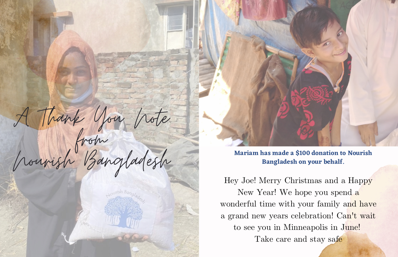 The Nourish Bangladesh Gift Card offers the perfect solution to these age old worries about gift giving. We are sure your gift recipient will appreciate being part of this noble cause of helping fight hunger in Bangladesh. And hey, they cannot regift this to you!